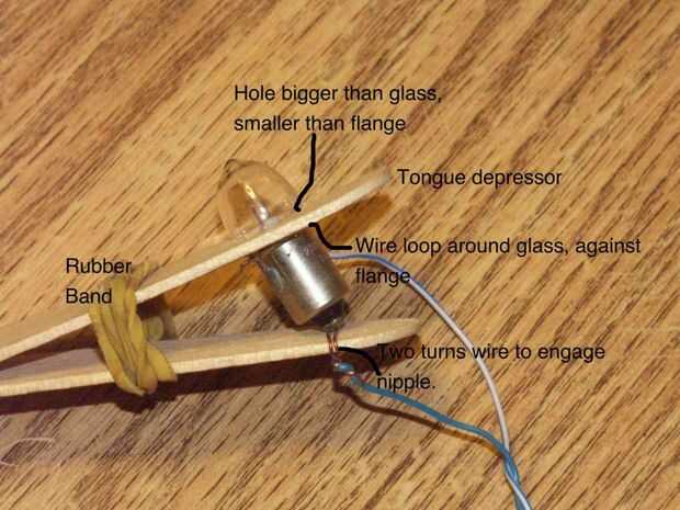La imagen muestra un "enchufe" que llevará a cabo una bombilla de linterna "ensanchado" normal (algo) bien en contactos con alambre normal. Voy a intentar conseguir a más cuadros de "proceso" si puedo encontrar mi depresores de lengua, pero la foto del producto terminado debe mostrar más de lo que necesitas saber...