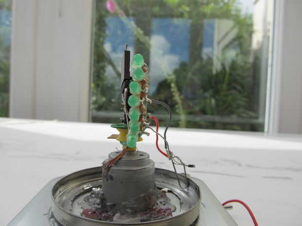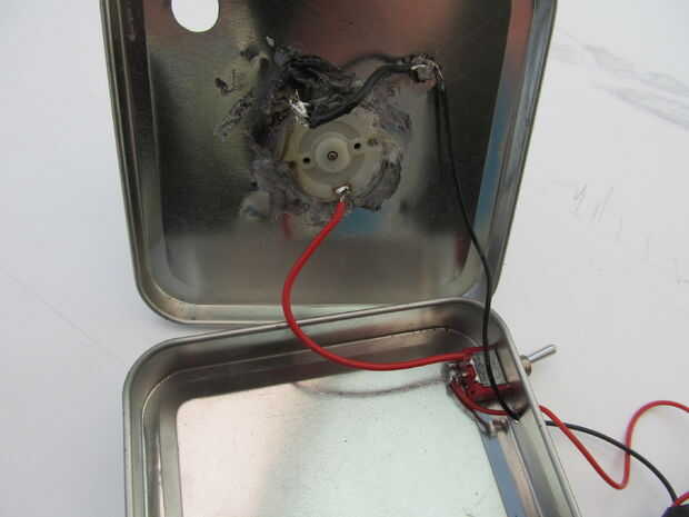 Energía del circuito a través de 4 baterías del AA que le dan una salida de 6v teóricamente pero en realidad es un poco menos, aunque es suficiente alimentar el Arduino y motor. Un clip de la batería está conectado al motor mediante un interruptor, el cable negativo es soldado a la tapa de la lata para el cepillo conectar Arduino a tierra. El positivo viene del interruptor a una entrada del motor y soldar un pequeño trozo de alambre de la entrada positiva del motor a la caja de metal de los motores.