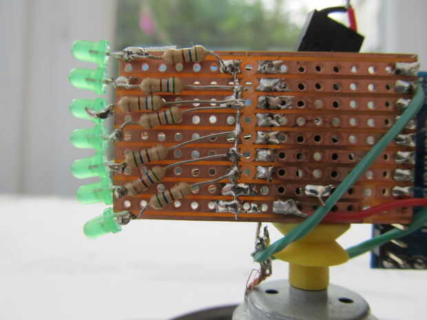 Los 7 LED ' s están soldados a un trozo de placa perforada, con sus cables positivos conectados entre sí cada uno con una resistencia individual, conecté los cables negativo del LED a los pines 3 a 9 en el arduino pro mini, véase el cuadro 2 para ver cómo lo alambré hasta más detalladamente.
