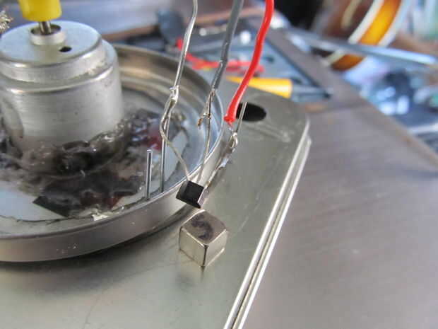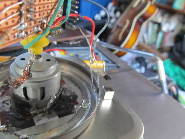 Para alimentar el Arduino mientras gira hay dos cepillos, el barril del motor está conectado con el cable positivo de la batería, usé un trozo de cobre de alambre que actúan como un cepillo para hacer un contacto mientras que gira el dispositivo, thew otro extremo se conecta a la placa perforada que está conectado a las piernas del LED positivo y el pin de VCC Arduino... Usé una banda elástica envuelve el cuerpo de Arduino y enganchado en el cepillo para mantener el cepillo del motor cubierta apretada.