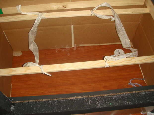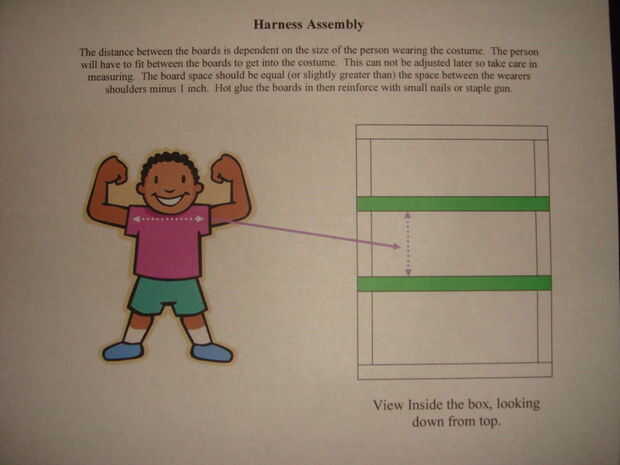 El traje se apoya en los hombros por debajo de la ropa lo que permite al usuario interactuar con la cara y ambas manos. Las correas de los hombros atadas o lo contrario ancladas a las restante 1 "x 2" juntas, dos mide 24" de longitud. Mida primero la anchura de los hombros del portador. El usuario tendrá que pasar a través de la parte inferior del traje y los tableros a don el traje. Añadir una pulgada a la medida y este es el ancho entre los dos tableros de apoyo de 24". Los tableros y conectarlas a las dos 40" juntas en la parte delantera del traje y en la espalda, primero utilizar pegamento caliente para ponerlos en su lugar y luego usar pistola de grapas o clavos pequeños para asegurar a la estructura.