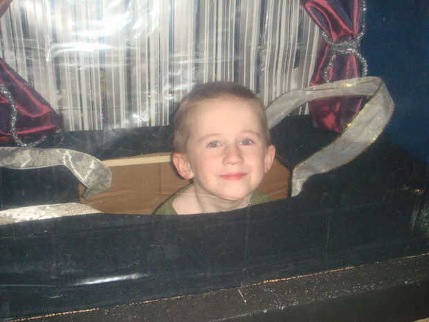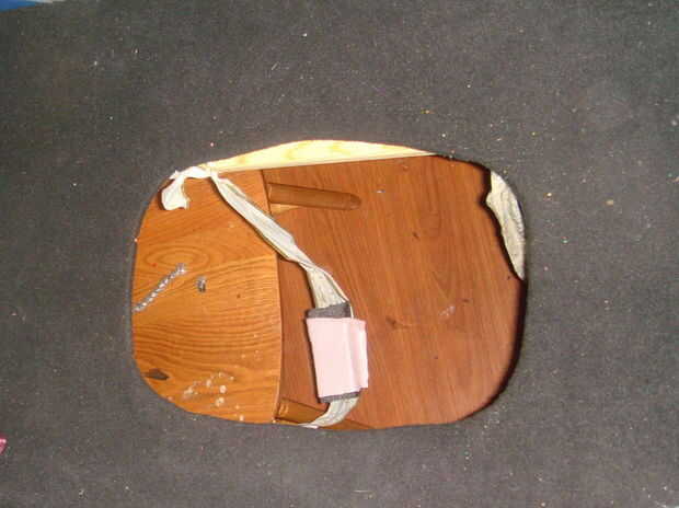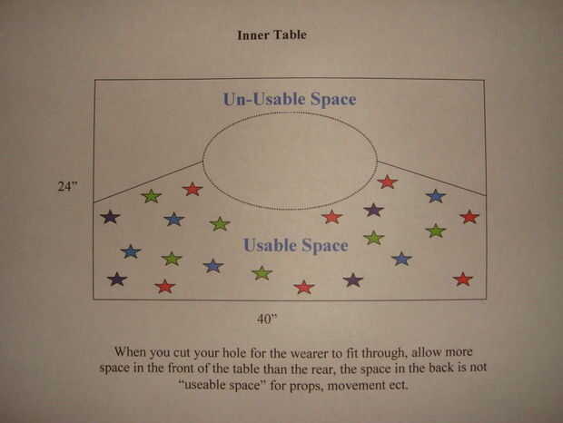 Una de las piezas de cartón a la izquierda del corte de caja original se utilizará para formar la mesa alrededor de Zoltar. Usted necesita cortar un agujero lo suficientemente grande como para caber a través pero lo suficientemente pequeño para dar la ilusión de que Zoltar sólo existe desde la cintura para arriba. Los seres humanos no tienen cintura circular, más ancho de lado a lado que de adelante hacia atrás. Inicio de la parte posterior de centro del panel de cartón, más cercano al borde posterior que en la parte delantera. Dibujar un óvalo grande uniforme, lado largo corresponde a la parte más larga del panel. Trate de ir a través del agujero en la posición de "diver". Si se trata de un ajuste fácil tiene un agujero de tamaño perfecto, si no caben o es un apretón apretado ajustar uniformemente según sea necesario.
