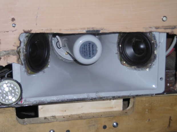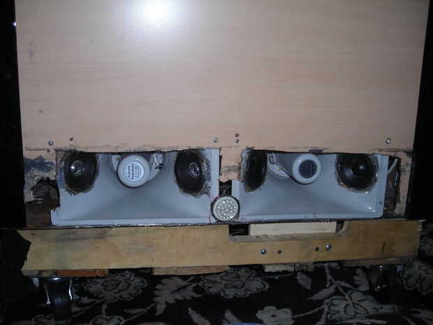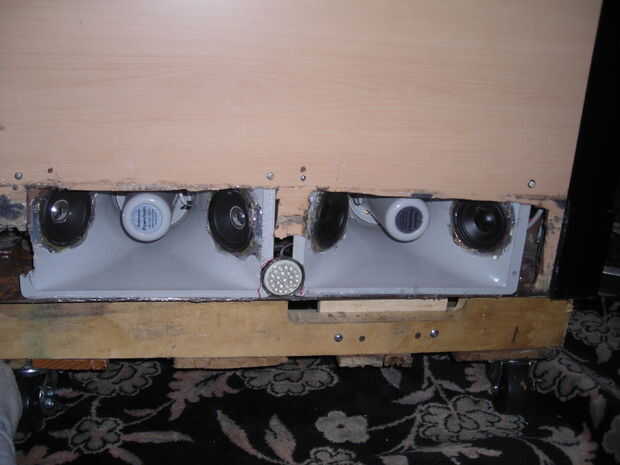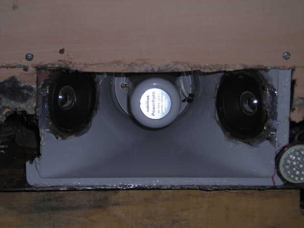 PERO no importa lo que hice, todavía no era bastante fuerte, y todavía tenía limitaciones de espacio. Y nació la idea brillante (mad) #2; Incorporado rango medio altavoces en conos PA (alta gama) añadido 1000w de amplificadores y viola (cuadrado)!!