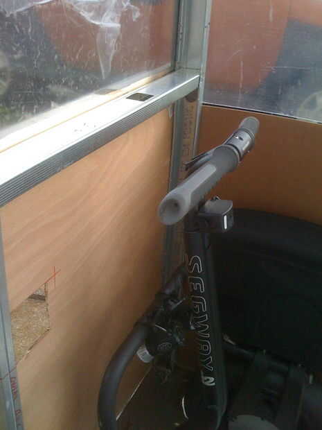 proyecto DIY, construido sobre un segway, con 1000 watts de amplificación, micrófonos inalámbricos, monitor audio bluetooth, dos vías de comunicación con un spotter, 7 altavoces, Micro controlado por luz.12 cathoid frías luces negras, más de 200 LEDs