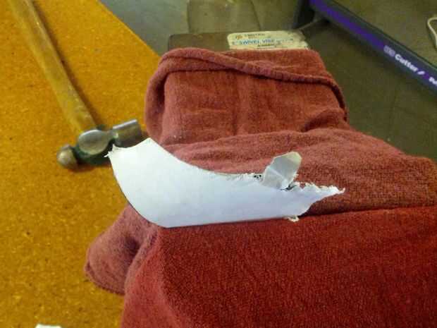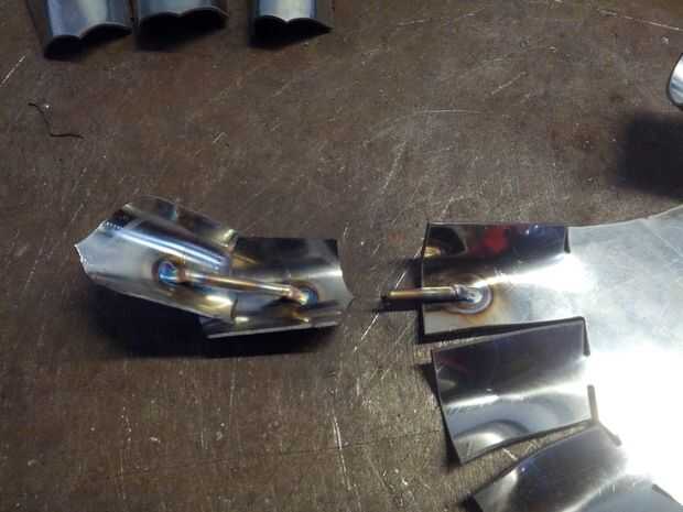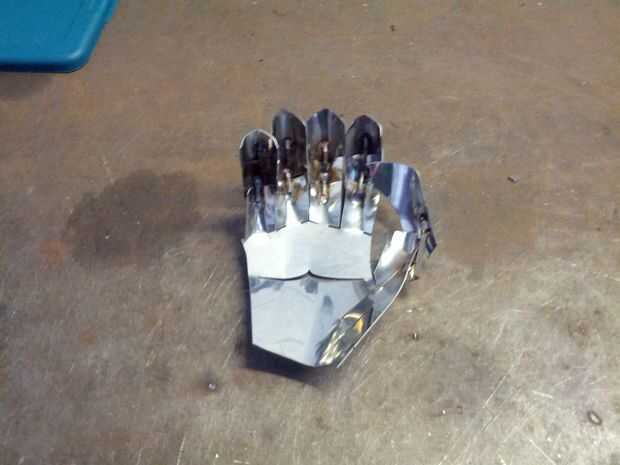 Estas manos metálicas son lo suficientemente pequeñas como para que no tenía que usar cualquier equipo para hacer el doblez. Con la ayuda de una mordaza y un par de amigos, hemos sido capaces de poner una bonita curva en cada una de las piezas. Después de la flexión, un pequeño trozo de varilla de pasador fue soldada con autógena en la parte posterior de cada sección para conectar todos los dedos juntos. Los puntos de soldadura son un poco flexibles y permiten la mano para ser doblada en una posición final.