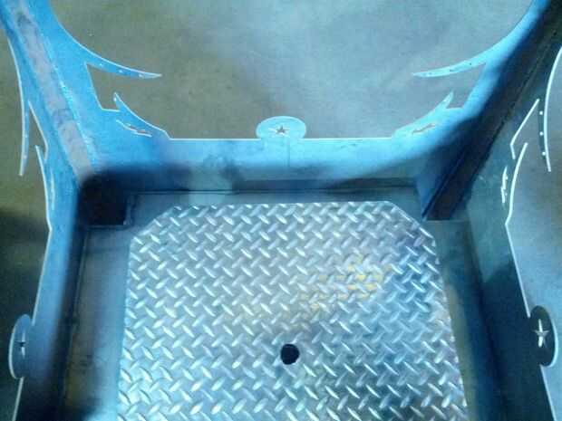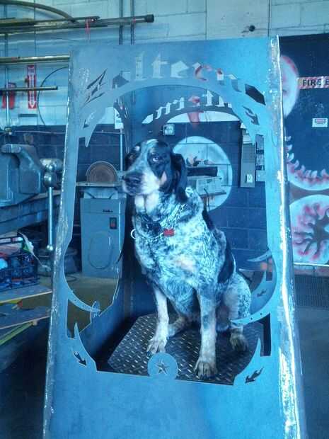 Todo el conjunto realizado en el paso 21 ahora estaba listo para ser instalada en la pieza principal. Agarré mi nivel de confianza para asegurarse de que todo era bueno y recto, luego hicieran algunos spot soldaduras para unir todo. Para probar para el peso y tamaño, nos dejó Huck, el mejor perro de la tienda en el universo, en la pieza. Él parece encantado. Un poco.