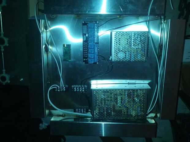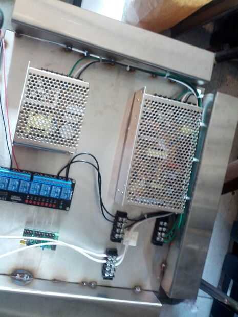 Tengo 2 fuentes de alimentación separadas en mi caja de... Estoy alimentando los servos en su propia fuente para evitar cualquier tipo de pico de voltaje gigante freír mi microcontrolador. El otro es una fuente de alimentación 5/12/24V de salida triple para los micro relés y dispensador de la tarjeta.
