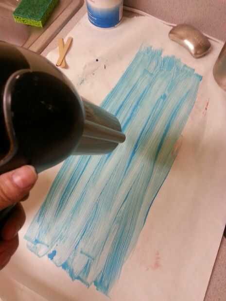 Ahora te toca usar la hoja de galleta! Con un cepillo de espuma, ligeramente cepille una fina capa de látex en la superficie del metal. Entonces... espera! El látex se seca rápidamente, pero si estás en un apuro, siempre se puede utilizar el secador de mano.