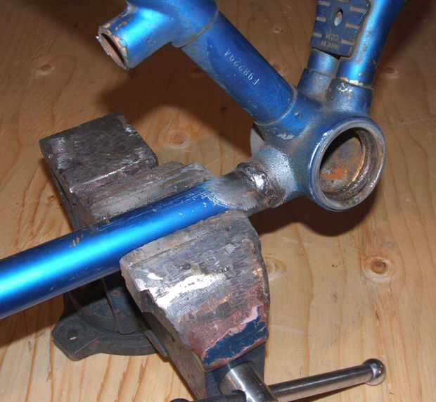 Una vez que el tubo de abajo estaba doblado hacia arriba para cerrar la brecha (fácil ¿no fue?), el área era sólido soldado con autógena como se muestra aquí. Si usted hizo su cuña en forma de corte en ambos lados del tubo, el tubo se mueve en perfecta alineación con el resto de la estructura.
