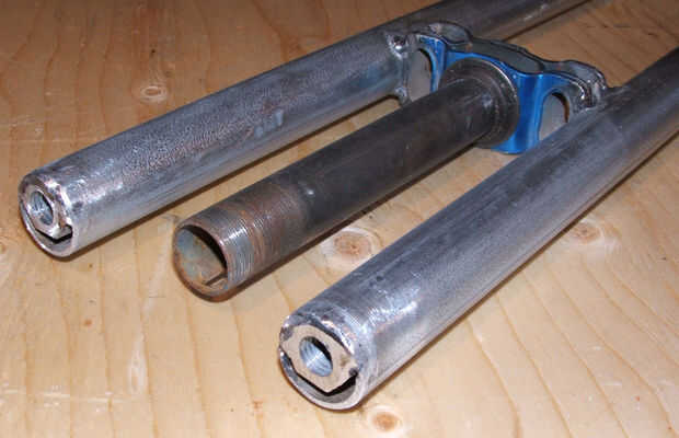 Soldar ambas tuercas rasante en los extremos de la horquilla como se muestra aquí. El más cercano al centro te puede conseguir, mejor. Si las nueces son un poco más pequeñas que el interior diámetro del tubo, soldar simplemente como todo lo que pueda, asegurándose de que ambos enfrentan el mismo lado del tubo y centrado.
