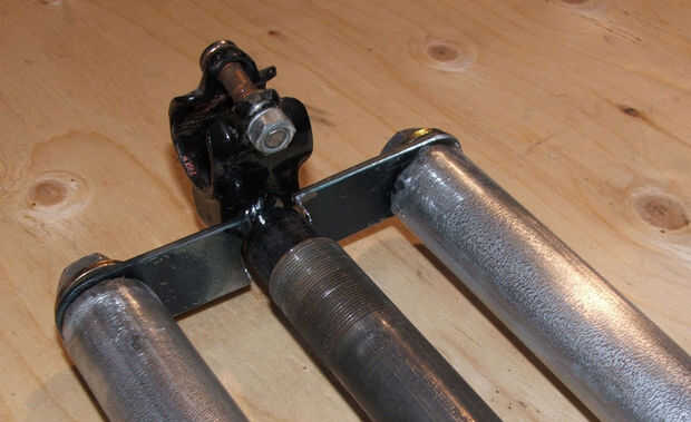 Una vez que todo está configurado, todo lo que tienes que hacer es colocar el cuello de cisne en el vástago de la horquilla y soldar las dos placas en su lugar. Es mejor hacer unos sólidos tack soldaduras, después comprobar, teniendo cuidado de no golpear los hilos de rosca de horquilla con la varilla de soldadura. Una vez virado en su lugar, se verá como lo hace aquí.