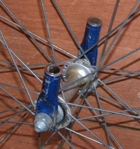 Para obtener las punteras alineadas en el lugar adecuado en los extremos de la horquilla nueva, primero perno les a una rueda delantera como se muestra aquí. Deben fijarse firmemente y en el mismo ángulo horizontal. Además, asegúrese de que el extremo aplanado que sostiene el eje no está doblado. Si es así, tírelo derecho con un par de pinzas. La distancia entre las punteras es generalmente 5.5 pulgadas para una rueda delantera. Estas bicicletas antiguas pueden ser incluso menos.