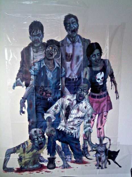 Esto es una vuelta de tuerca al clásico pasador de la cola sobre el juego de donkey. Mi hermana tenía esta cosa de decoración de pared enorme de un grupo de zombies y teníamos armas de juguete con balas de suctioncup así que hicimos este estímulo del momento.