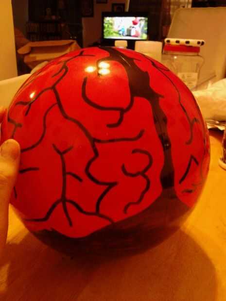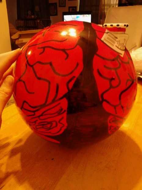 Compré una bola roja llana en walmart y utiliza marcador indeleble para hacer un cerebro.