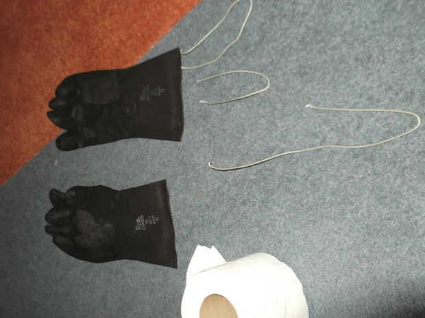 Para el relleno de los guantes necesitas papel higiénico como esto puede ser roto en pequeñas piezas suficientes. Si realmente desea que usted puede darle la mano a un esqueleto de alambre colocando un tramo de alambre en cada dedo del guante al relleno. Esto debería permitir una forma más realista y una real fuerza de agarre en las manos pero no es necesario.