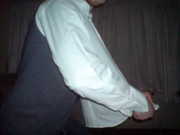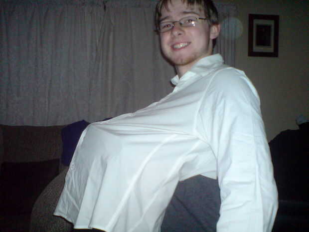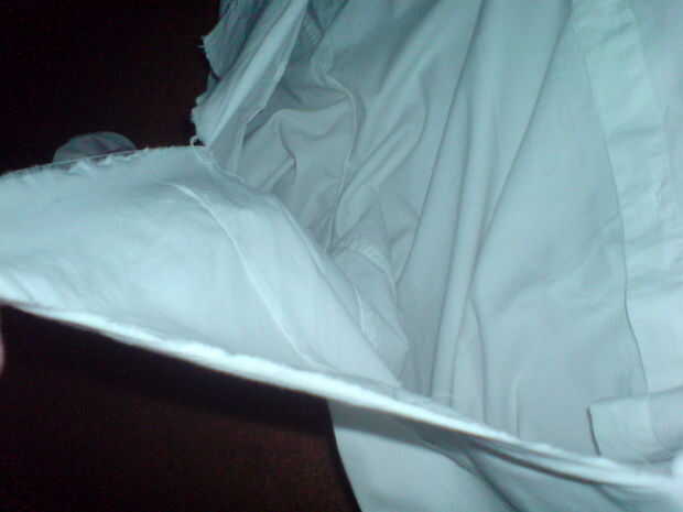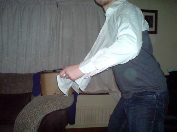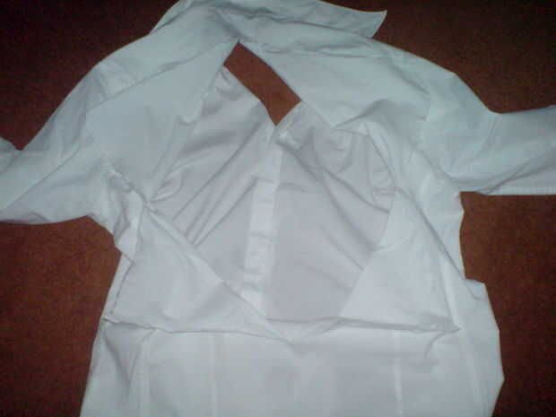 Intente cortar para que existen las aletas como se muestra en las fotos anteriores. Estas ayudarán a ocultar el truco de la ilusión. Probar la camisa cada ahora y después por puttting sus brazos y la cabeza por el agujero que usted acaba de hacer, asegúrese de que se sienta justo antes de pasar.