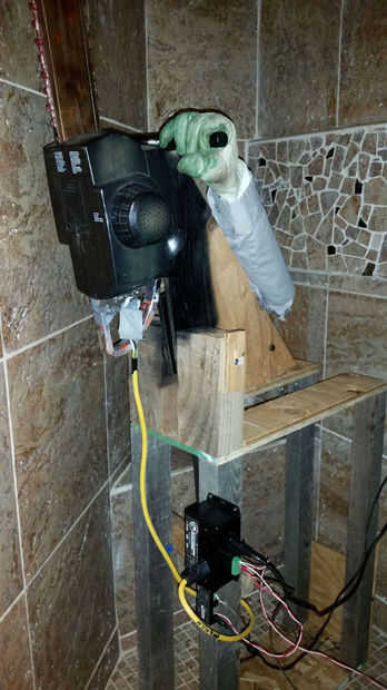 Ya teníamos en la mano una sierra de cadena plástico del juguete, que hizo un ruido de motosierra bastante decente cuando apretó el gatillo y aún corrió su cadena (plástico opaco) alrededor de la barra de cadena. Ambos efectos duraron unos 9 segundos. Hemos hecho un brazo de zombie para "sostener" la Sierra de cadena, usando un guante de látex con un montón de maquillaje macabro, una camisa de franela y algún relleno. Sujeta un triángulo de madera por encima y detrás de la sierra para proporcionar el accesorio para el brazo de acoplamiento.