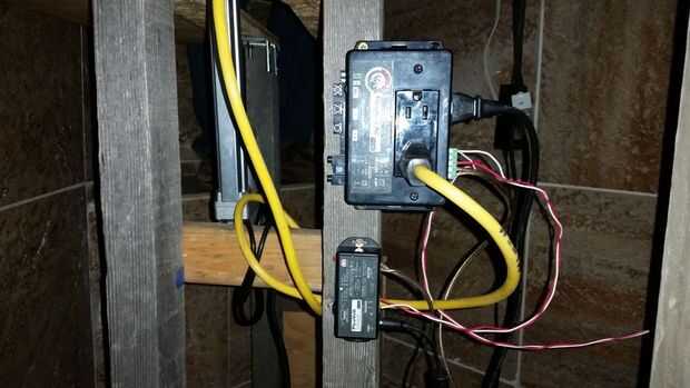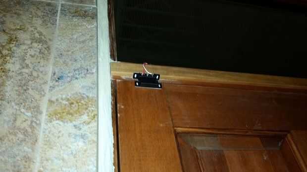 - Esta hélice utiliza un sensor magnético de la puerta, similar a las encontradas en sistemas de seguridad. Tenía tres terminales de tornillo: normalmente abierto (NO), normalmente cerrado (NC) y el campo común. Hemos querido de nuestra escena para activar como la puerta estaba cerrada por alguien entrar en el cuarto de baño, por lo que tenemos conectado a los controladores de uso común y NO. Necesitamos de un funcionamiento de la puerta al controlador debido a seguir una ruta discreta a lo largo de la pared de 20 pies. Hemos sido capaces de utilizar cable de 2 conductores timbre para esta serie, menos costoso que el cable de aspersor de 5 conductores que se utilizó para otros sensores. Esto era porque los otros sensores necesarios 2 cables para una fuente de energía y 2 más para la señal de disparo. El interruptor magnético no requiere una fuente de energía ya que la corriente eléctrica el imán sí mismo.