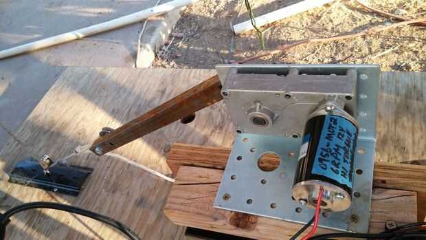 Apoyos de susto vende un brazo del eje para conectar con los dispositivos rotatorios, PN 0956-enlace-ARM2, que proporciona un radio de 2.5" de rotación. Necesitábamos un radio de 17", por lo que extendimos empernando en un pedazo de 3/4" de acero cuadrados del tubo de Ace Hardware. El brazo del eje del motor está conectado a la palanca con un trozo de cuerda de nylon trenzado.