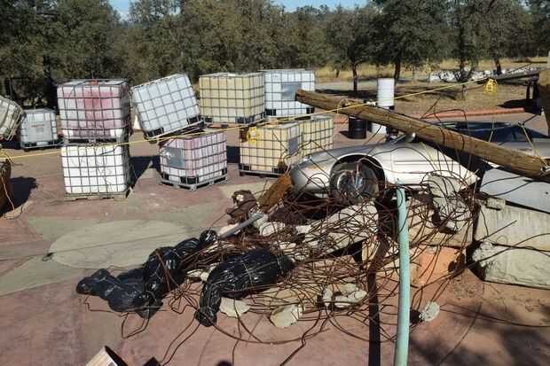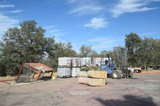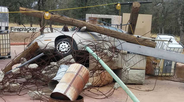 También se estableció contacto con empresas locales, vertederos y amigos para pedir prestado artículos. Varios grandes cajones antibarro vinieron de una empresa por el camino que recibe suministros en ellos y no se puede reutilizar, pero deja hacia fuera "para un buen hogar gratis." Un distribuidor de coche había prestado nosotros dos coches coches destrozados, y un negocio de jardinería cercano nos prestó un camión destrozado y algunos viejos beat hasta postes de teléfono. De la planta de hormigón nos trajo muchos barriles, algunos de ellos viejo y oxidado; algunos químicos plástico grandes bolsas (y no radiactivo) en marcos de aspecto esquelético; un tremendo lío de tangled rebar y concreto; y un montón de equipos desechados, viejas máquinas de fax, etc., que utilizamos para el "puesto de mando". Usted consigue el cuadro.