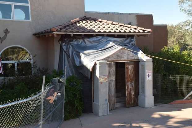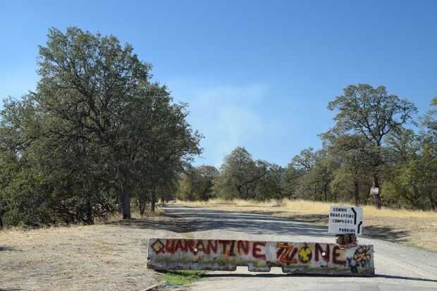 La entrada a la cuarentena de zombie compuesto está diseñada como una escena de accidente caótico se puede caminar a través de en un mundo post-apocalíptico zombie. Hemos querido se estrelló coches, humo y llama, agua de rociadura, regueros enmarañados de concreto y varilla, etc, etc, etc.. Puesto que nuestro anfitrión, Gary, es copropietario de un planta de fabricación prefabricados de hormigón, tuvimos una rica selección de piezas de chatarra para elegir y ser inspirado. También tuvimos los acoplados de plataforma de camión de 18 ruedas mencionados, carretillas elevadoras y mucho más para acarreo y colocación de todo.