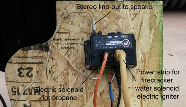 Porque esto fue un susto exterior que cubre un área grande, utilizamos un altavoz grande 2.000 vatios alimentado, como DJ ' s usan en reuniones de buen tamaño. Esto está conectado al controlador con un cable mini estéreo conectado a la línea de salida de la CA de PicoBoo.