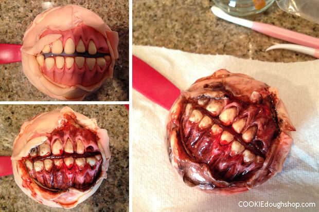 este fue mi primer intento, así que sólo voy a explicar brevemente cómo lo hice.Primero hice una simple prótesis haciendo un molde de mi mandíbula con juego de masa, y cubrir ese molde con látex líquido (recomiendo que pintarlo en capas finas con un