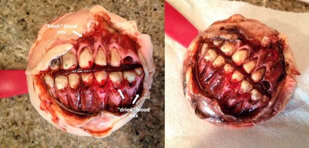 sangre fresca acabado: mezclar gel color rojo con gotas de vodka de limón extracto secado sangre mezcla rojo con una gota de azul y añadir gotas de vodka/limón extracto. con un cepillo, aplique la mezcla del color de "sangre fresca" alrededor del tejido de la piel rasgada, aplique la mezcla del color "sangre seca" alrededor de las encías, especialmente donde las encías se encuentran con el tejido de la piel. y en todo el contorno de los dientes y las abolladuras, para darle una impresión más 3D. Dejar secar y montar la cubierta de la Magdalena encima de la cubierta de la Magdalena.
