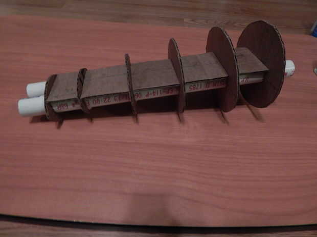 Ahora, a partir de oval # 1, deslice el óvalo en las tuberías de PVC de 1 pulg. ¼ desde el extremo de los tubos y el pegamento en su lugar. A continuación coloca uno 1 Espaciador de rectángulo ½ pulgadas en cada lado y corredera ovalada #2 al ras contra los espaciadores y encolar en su lugar. Ahora coloque a un espaciador cuadrado de 2 pulgadas a cada lado entre oval #2 y #3 del óvalo y encolar en su lugar. Repetir este proceso para óvalos #4 y #5. Por último, coloque el espaciador de pulg 1 de márgenes a cada lado entre óvalos #5 y #6 y pegamento en su lugar.