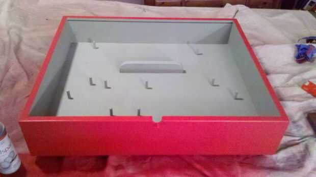 Una vez que el interior fue acabado, con la incorporación de la plataforma para las cáscaras de la escopeta en algún momento durante esta etapa de la pintura, enmascarado todo apagado. Yo probablemente podido sobre él una forma más fácil, pero me encanta jugar con pintores cinta jajaja. Una vez todo fue enmascarado, roto hacia fuera de la red y me fui a la ciudad en el exterior con el segundo intento de hacer el rojo, esta vez resultó mucho más suaves.