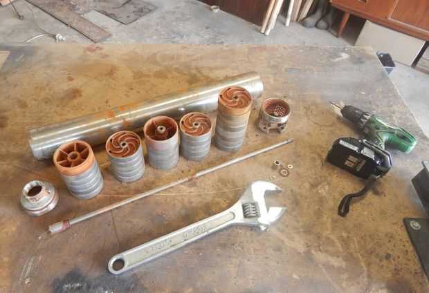 Me tiró la bomba aparte y quitado el eje. Es la longitud perfecta. Era un poco demasiado delgada, pero justo necesitaba algunos casquillos con tubo de cobre y la manguera para hacerlo funcionar.