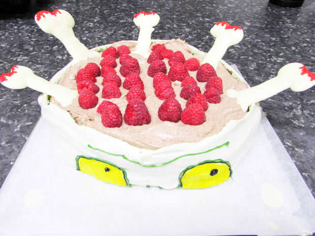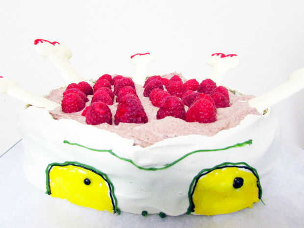Para Halloween, he confeccionado a una Pavlova temática Zombie. Básicamente, su cabeza es el Pavlova y top es su sangre chocolate expuesta y cerebros de frambuesa. Para agregar un poco de altura, he añadido en algunos huesos de chocolate blanco. Esto es bastante fácil de hacer y un divertido tratamiento para los niños este próximo Halloween.