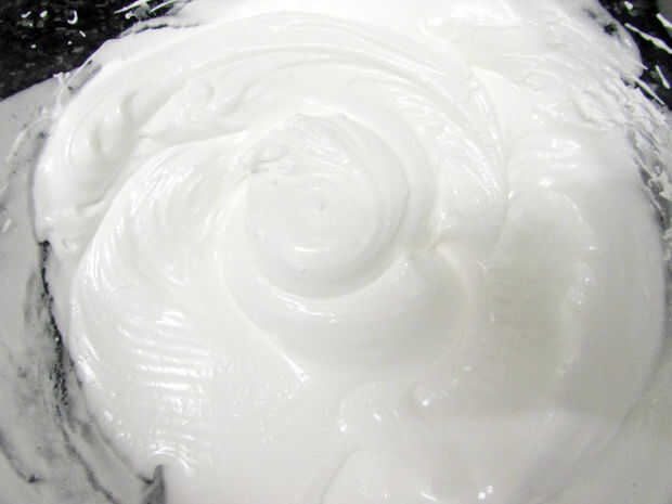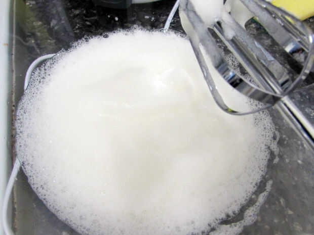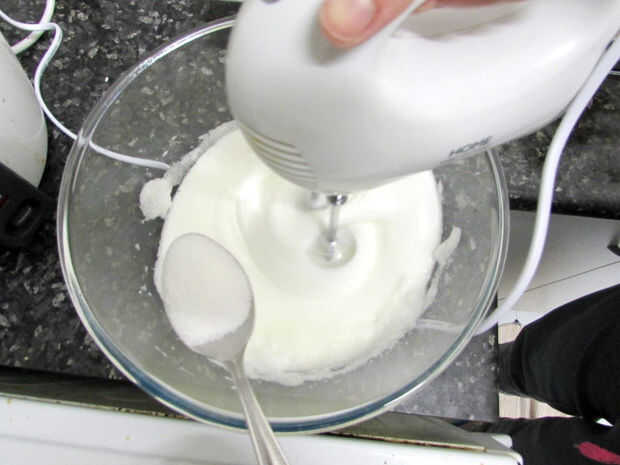 • Batir las claras de huevo. Cuando se convierte en espuma como se muestra en la imagen 2, agregar en 2 cucharadas de azúcar a la vez mientras batiendo para disolver e incorporar el azúcar bien.