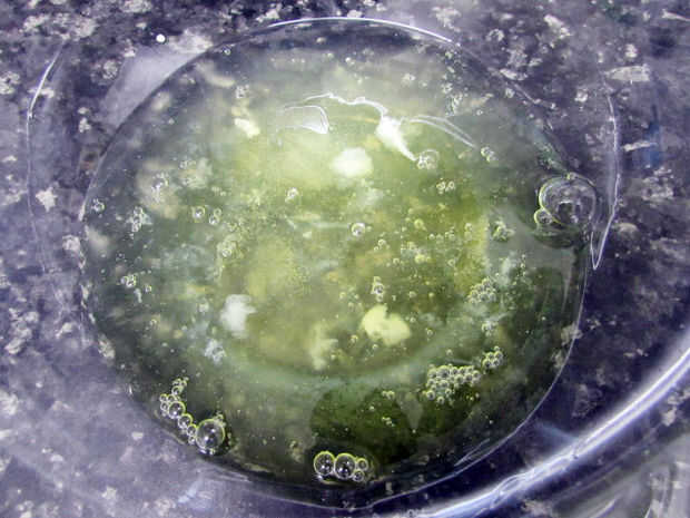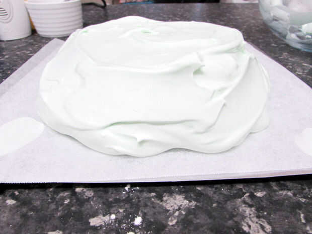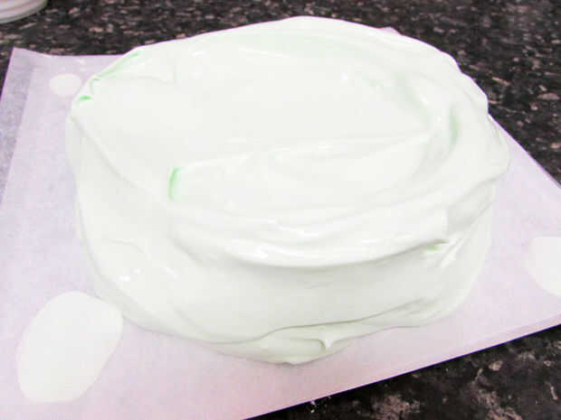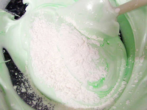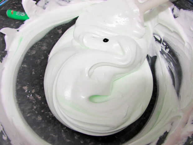 • Pliegue en el gel de color verde alimentos una gota a la vez hasta que el color es tu tono deseado de color verde. (Tardó unos 3 a 4 gotas para conseguir un color verde pastel con el mío).