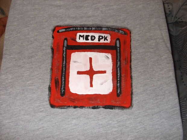 6. por último pinta "Med Pk" o "Primeros auxilios" en la etiqueta del rectángulo blanco y añadir pintura gris en las líneas negras como cremalleras.