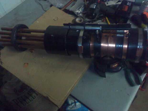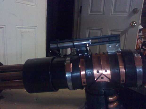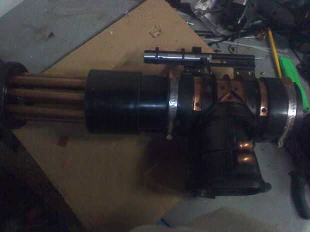En este punto yo podía dejarlo negro, necesitaba sólo un poco más lejos. Mi hijo sugirió utilizamos un láser pen viejo como un espectáculo, lo hicimos. La vista se monta en la parte superior, reutilizar de un proyecto, tuve dos cables que he podido conectar a I botón montado en el mango en uno de los dos codos de cobre. El otro codo cobre tiene un botón para encender una luz tinto barrica. El carril de la vista se monta en el cuerpo de plástico negro con algunos soportes en "L" de aluminio. Tenía demasiado cobre en el frente, demasiado negro en el cuerpo. Corté tiras de cobre intermitente para caber dentro de las aletas de la "T" de drenaje. El parpadeo se asegura usando pequeño negro tornillos autoroscantes.