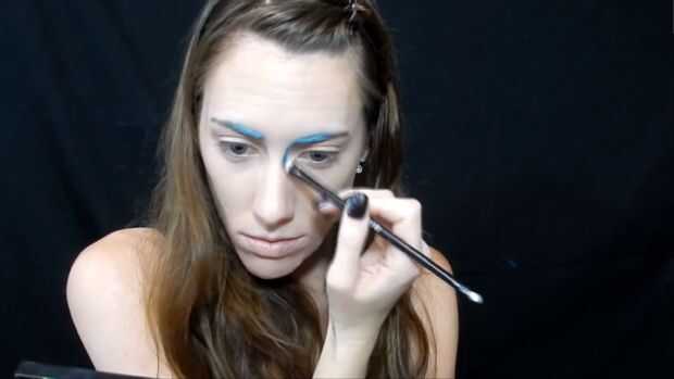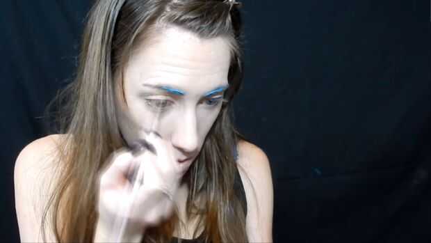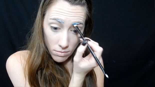 Utilizando un delineador de ojos blanco llenó en la mitad de mis cejas, luego usé una sombra de ojos azul clara a que blanco, y luego usar una sombra marrón mate en los extremos de mis cejas que mezcla el azul, después de comencé a llevar ese color azul abajo de mi nariz.