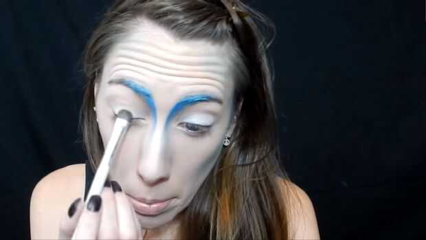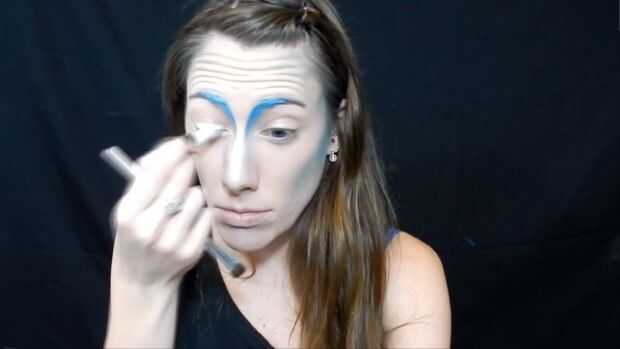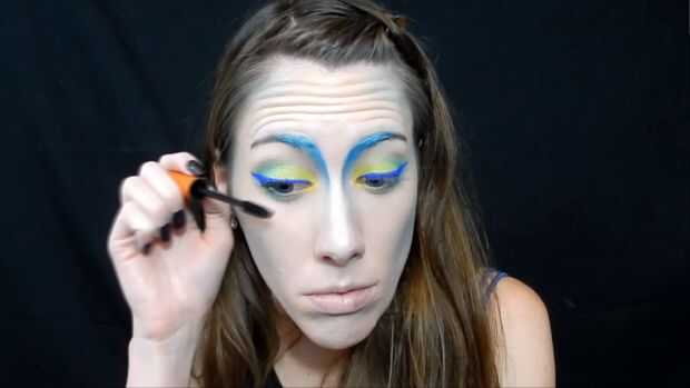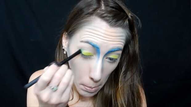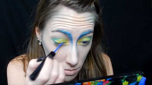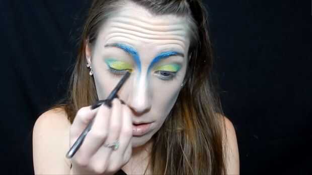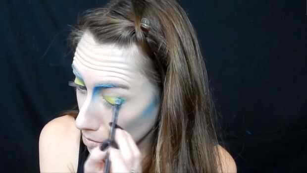 Utilizando el lápiz jumbo de NYX en leche he añadido a mi tapa, entonces agarré esta sombra de ojos amarillo/verde para ir por toda la tapa, luego usé dos verdes más oscuro en la esquina exterior de mezcla en el pliegue, entonces agarró una sombra de ojos amarillo brillante para el interior esquina de mis ojos, he utilizado un delineador de ojos azul brillante para un ala de gato , entonces pasado utilicé un rimel negro.