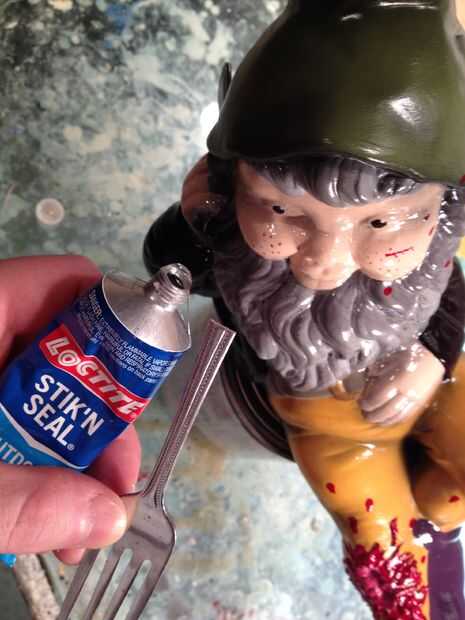 2. Poner un arma en la mano de un asesino gnombie.  Si taladra un agujero a través de la mano de un gnomo y palo algo a través del agujero, parece que está llevando a cabo algo.  Mire alrededor de la casa. ¿Qué utilizaría para defenderse contra los no-muertos littlest un gnomo? ¿Por qué una cuchara? ¿O un tenedor?