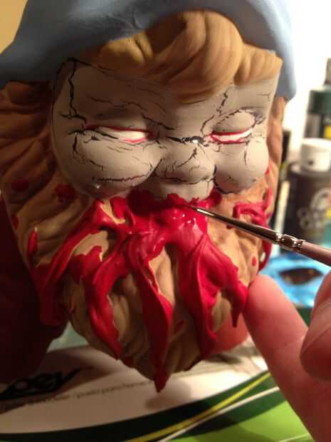 Todas las áreas de sangre y gore pintar con la pintura de color rojo sangre.  Usted puede ser muy grueso cargar el pincel con pintura y slather encendido allí agradable y espesa.  Asegúrese de que usted consigue algunas salpicaduras en otras partes de la gnombie demasiado. Se espera que gnombies son comedores desordenados.