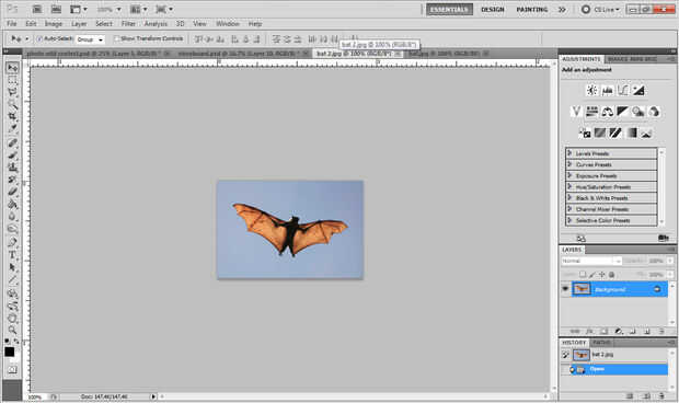 Herramienta de selección rápida---> pintura herramienta (para oscurecer)---> herramienta de mover (para arrastrar los murciélagos en la escena).