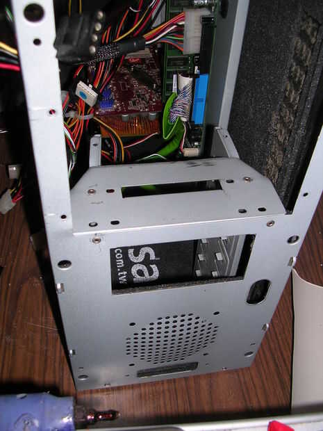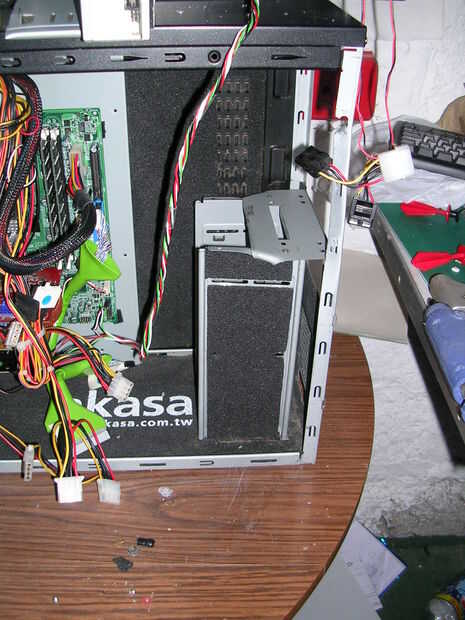 Una vez que habían sido quitadas las bahías encontré que la bahía de disco duro era muy inestable así que corté un pedazo de la caja pequeña y pop lo clava en su lugar para anclar la unidad de Bahía para el caso.