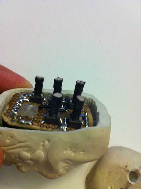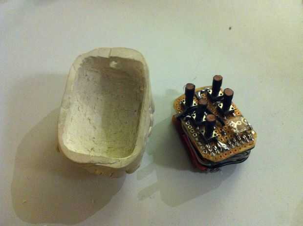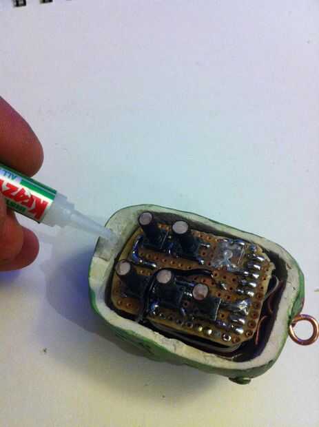 Con una pistola de pegamento caliente aplique una gota de pegamento caliente en el fondo de su vivienda de barro e inserte la placa de circuito.