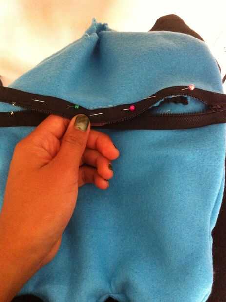 Coser el cuerpo (mi cuerpo para mi Zonster es azul) y luego corte donde el bolsillo/vientre luego coser el bolsillo/barriga, luego coser la cremallera