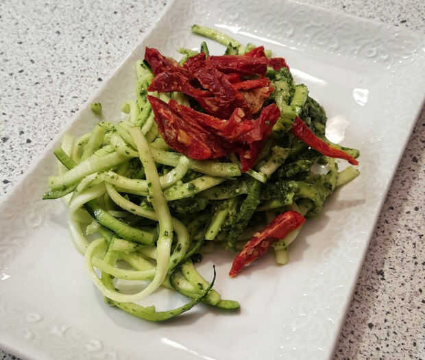 Este plato de pasta al pesto de sabor pollo lleno con zoodles (fideos de calabacín) va a cambiar su mente acerca de alimentos saludables. Toma literalmente 15 minutos o menos para hacer y si sirven este plato a tu familia sin decirles es zoodles, no