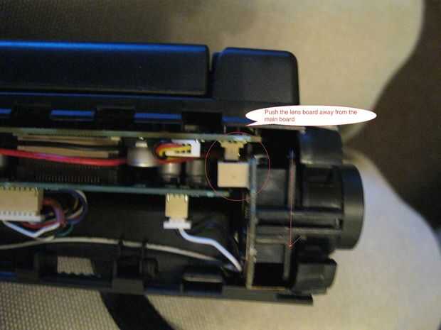 La Junta lente es simplemente empujar ajuste conectado a la placa principal. Con los tornillos fuera, tenía espacio suficiente para conseguirlo el tablero del sensor de la placa principal.