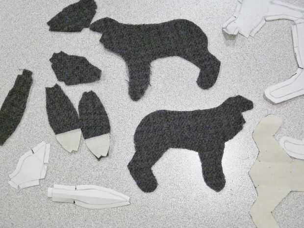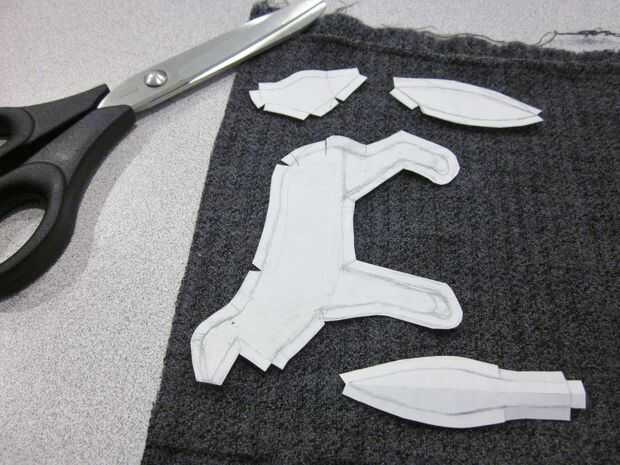 Ahora, cortar las piezas de la tela. Solo tengo las piezas del patrón sobre la tela mientras que rastrear con un Sharpie punto fino. Si estás usando para telas de color diferentes, asegúrese de que la parte de abajo y las puntas de la cola se cortan de color contrastante de la tela.