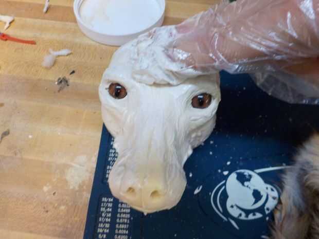 Cubrir todo el formulario (incluyendo su trabajo de arcilla) en una capa de pasta de cuero. Deslice suavemente el formulario a través de la boca de la piel, teniendo cuidado de no conseguir arcilla o pasta en la piel. Coloque los protectores de oído hacia abajo en las ranuras que tallado y presiónelas firmemente en la arcilla. Las esquinas de la parte inferior de las orejas deben quedar nivel a la cabeza, no cualquier más alto o más bajo. Posición de las orejas tan naturalmente como sea posible según sus cuadros de referencia.