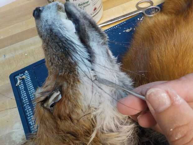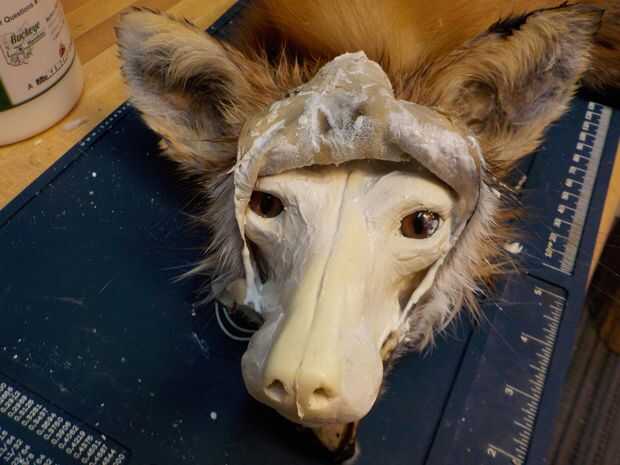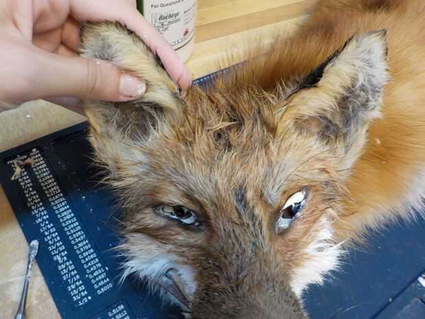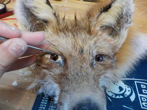 Después se colocan las orejas, comienza metiendo los bordes de las mandíbulas en las ranuras del labio de la forma. Para ello utilice una herramienta de escultura pequeña o destornillador plano. Tenga cuidado de no empujar los agujeros en la piel como haces esto. Meta a la boca hasta que el cuero negro de los labios no se aprecia mucho, si en todos. En zorros es natural que algunos piel del labio en la parte delantera de la boca, pero nunca en las esquinas posteriores, y nunca excesivamente. Los párpados necesitan ser correctamente esculpido y formado así. Asegúrese de meter los párpados están contra la superficie de los ojos de vidrio por lo que no existen brechas y arcilla exceso mínimo visible. Una vez más, consulte las fotos de referencia de animales vivos para determinar mejor cómo desea colocar la expresión facial.