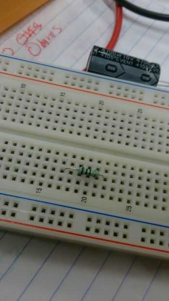 despues colocaremos el condensador con la pata negativa(corta) conectada a la resistencia. (imagen 2) y la positiva en cualquier lugar queramos.